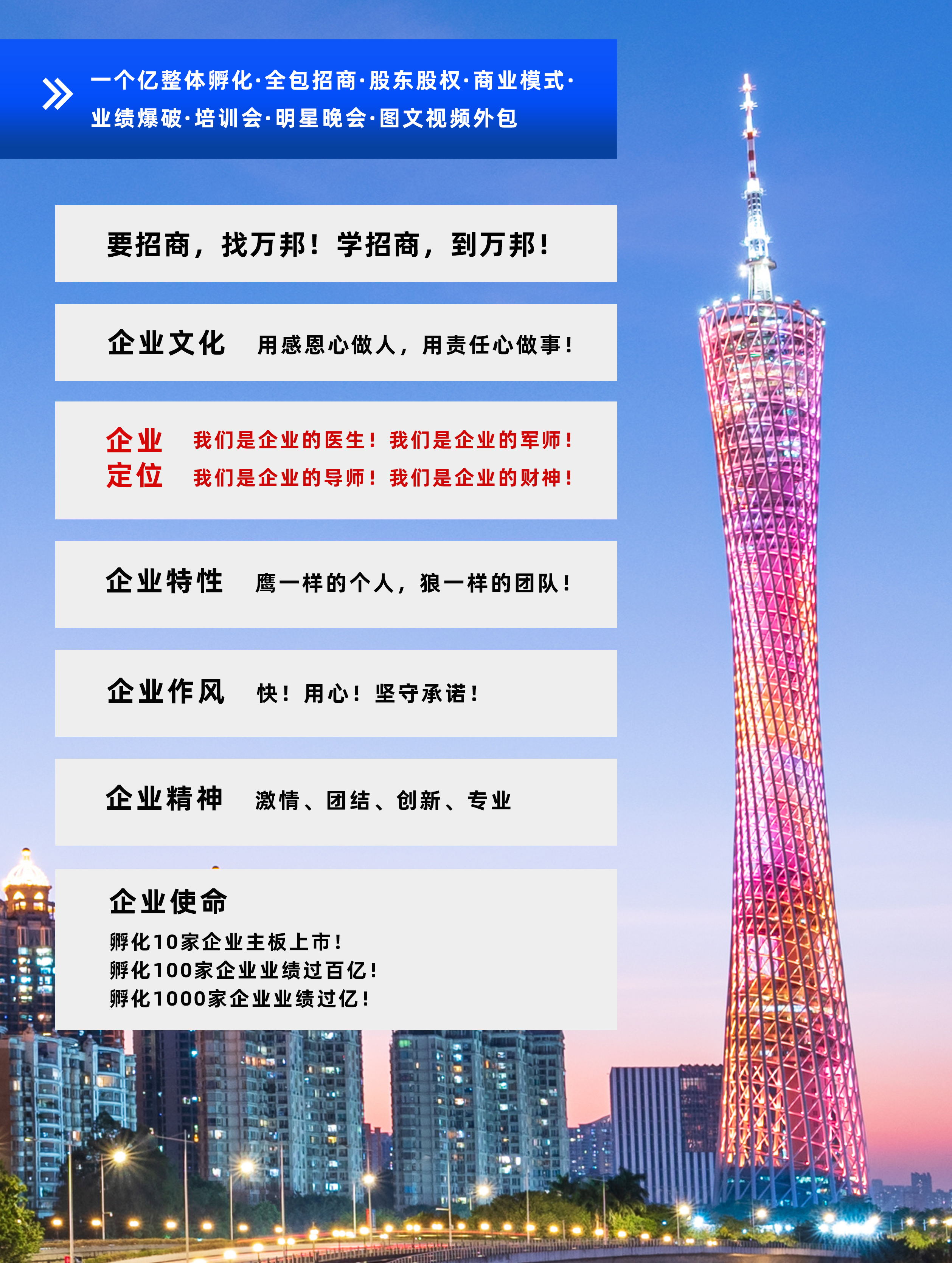 萬(wàn)邦集團(tuán)成立于2003年6月,專(zhuān)注于為企業(yè)進(jìn)行招商和整體孵化,包含公司診斷、產(chǎn)品定位到量身打造商業(yè)模式系統(tǒng),再到投人、投錢(qián)、投資源,一起干的分紅股東招募,鐵血軍團(tuán)的打造,全國(guó)招商會(huì)議,為企業(yè)建立一套完善;成熟的招商系統(tǒng),教育系統(tǒng)、培訓(xùn)系統(tǒng)。